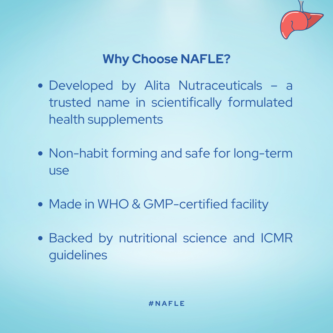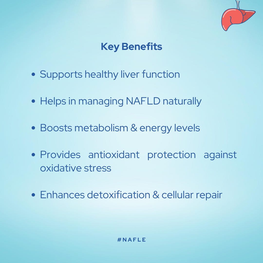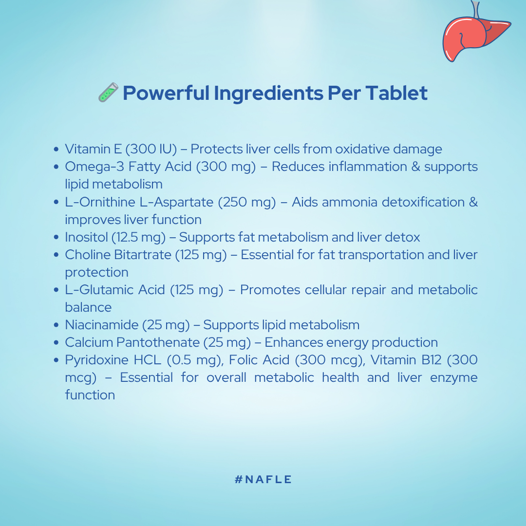 NAFLE is a specially formulated nutraceutical supplement crafted to support liver health and aid in the management of Non-Alcoholic Fatty Liver Disease (NAFLD).It combines a potent blend of vitamins, amino acids, and essential nutrients to promote optimal liver function, improve metabolism, and boost overall vitality.